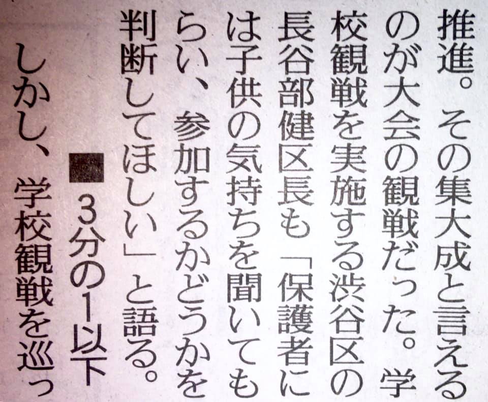 主には中止した港区や13万人の児童・生徒の参加が新型コロナウイルスの拡大で、今や僅か2万人を切りましたが、そのうち1/3(人口23万人しかない)が渋谷区である現実が残念なことです。