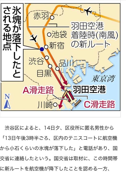 渋谷区で最多の住民の多い地区での氷塊の落下なんてあり得ません!やっぱり旅客機は海から入り海から出る人命優先の飛行ルートにすべきである。