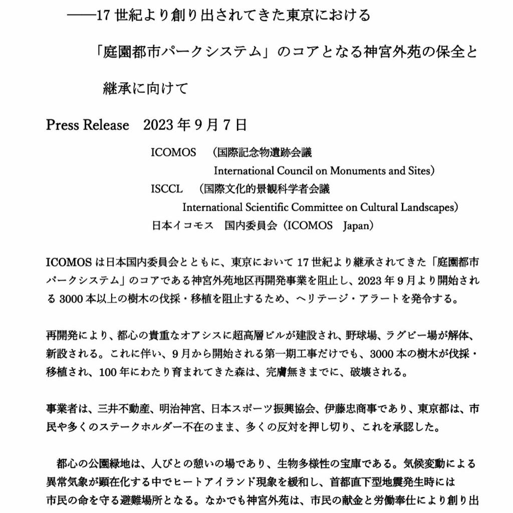 明治神宮外苑の再開発事業について、ユネスコ(国連教育科学文化機関)の世界遺産に関する諮問機関である国際記念物遺跡会議(イコモス)が7日、文化的資産が危機に直面しているとして、緊急要請「ヘリテージ・アラート」を出し、事業者や認可した東京都に計画の撤回などを求めた。