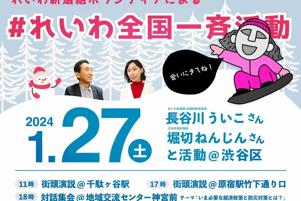 1月27日は地域交流センター神宮前にて、れいわ新選組の長谷川ういこ参議院政策委員と、国と渋谷区の防災と経済対策についての集会を行いました。