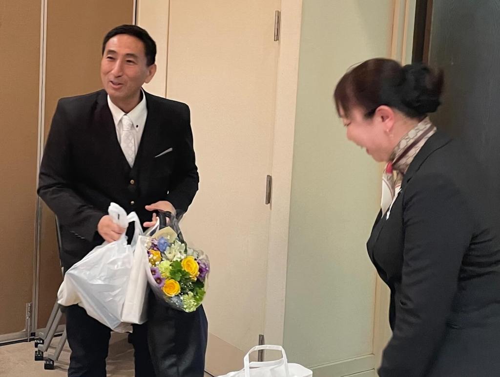 帰りがけに前会長から私への功労の花束を頂きました。役員の皆様には感謝しております。