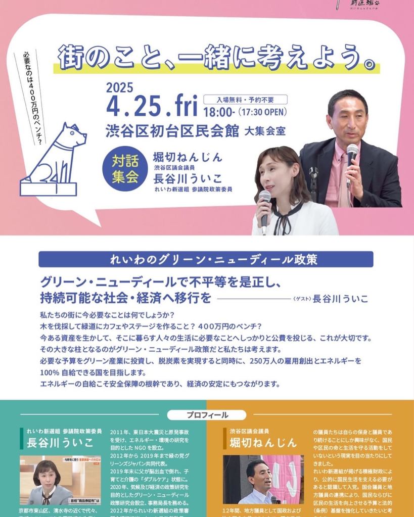 今週の4月25日金曜日18時より、渋谷区立初台区民会館第一会議室にて、れいわ新選組の参議院政策委員の長谷川ういこさんを招いてグリーンニューディール講演会を開催致します。
