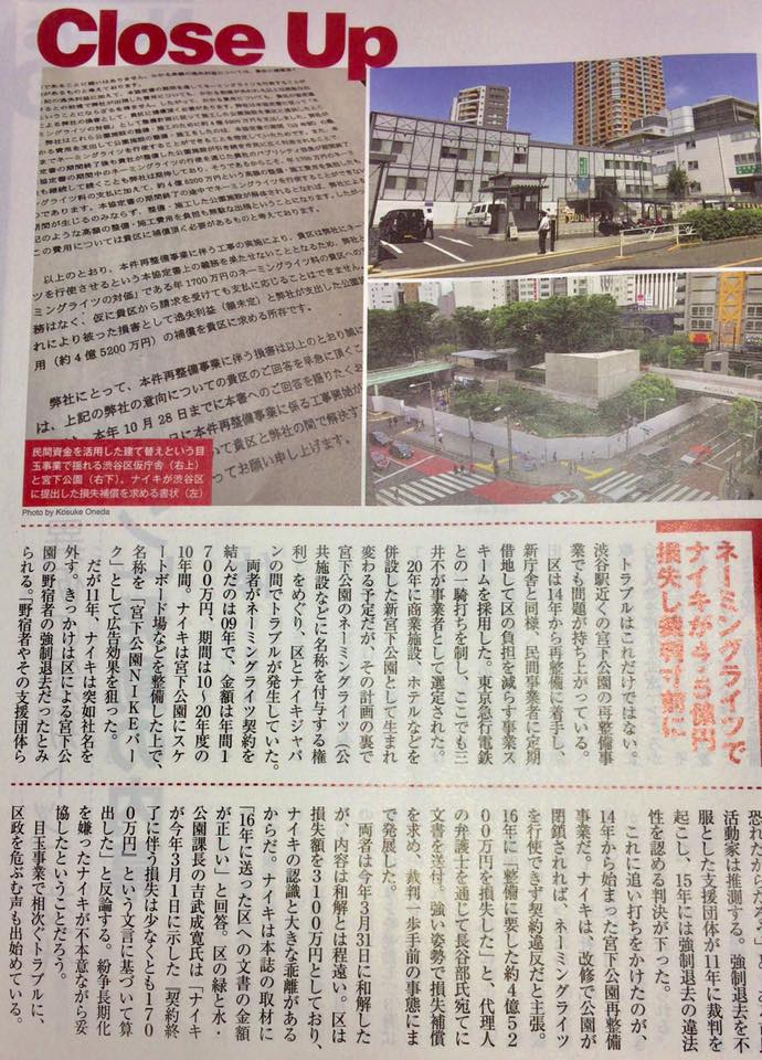 今度の記事は同時に区政の裏で長谷部区長の宮下公園のナイキ化計画失敗!の実態も掲載されております。